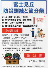 今週末の2月1日(日)、 「富士見丘 防災訓練 & 節分祭」 を行います(主催:富士見丘町会/防災会)。 場所は久我山小学校(校庭及び体育館)。 時間は、 ・10:00~11:30 防災訓練 ・1145頃~ 節分祭 となります。 防災訓練参加者には「参加記念品」のプレゼントもありますので(先着100名)、お時間のある方はぜひご参加ください。